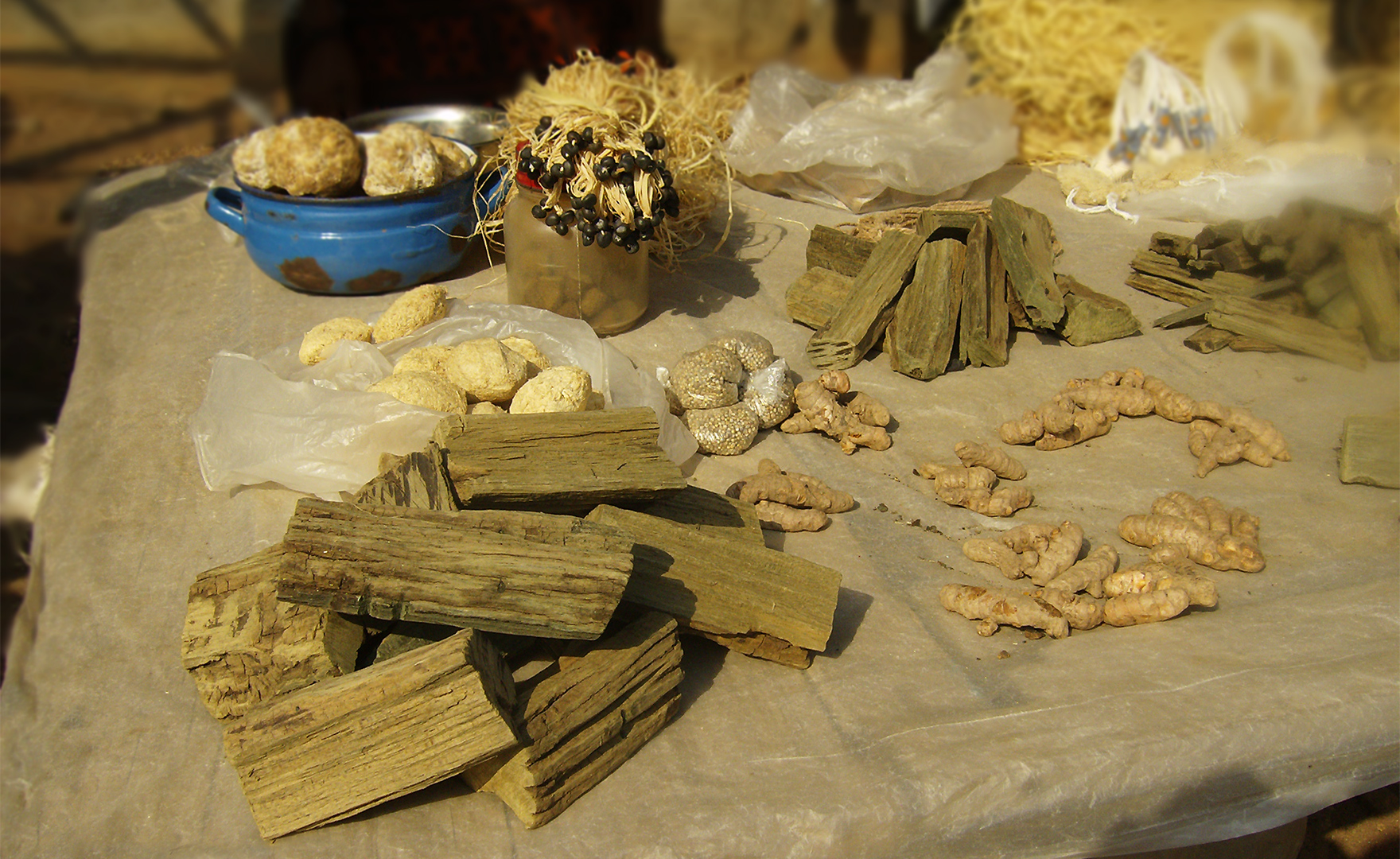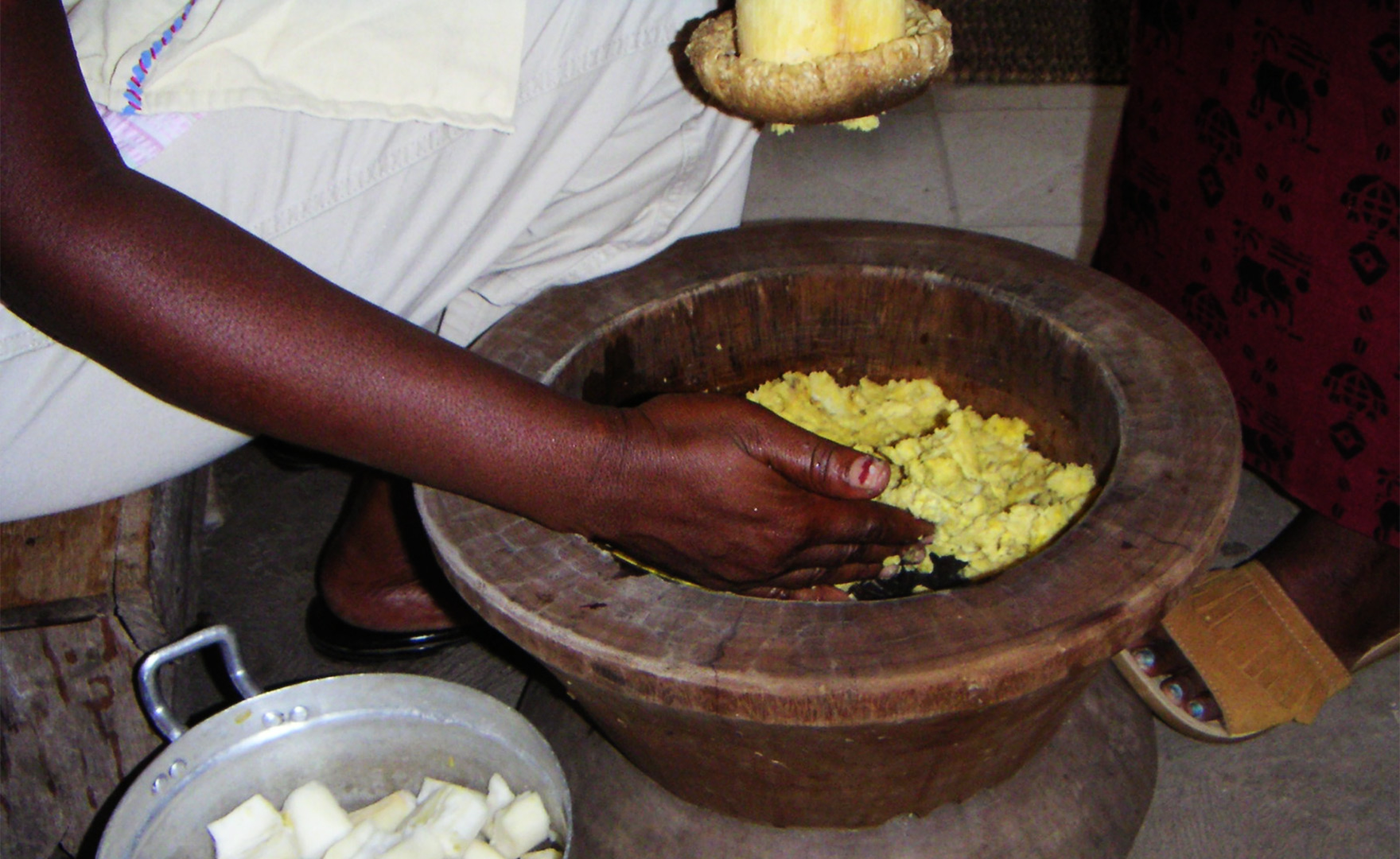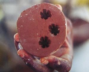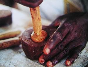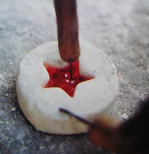 Stamping the Bead Forms In the next step, the moulds are stamped with holes in different shapes which will be filled with the crushed glass. The size and form of the holes determine the look of the finished bead. In order to form the pouring holes, wooden rods with artistically carved ends are used: star-shaped, round, elongated, cylindrical and diverse geometrical structures are popular. The bead-maker presses the carved end of the wooden stamp into the clay. One form can have a number of pouring holes. This depends on the size of the beads. For large beads it might be necessary to make an individual form for each.