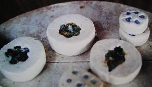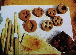 Clay Moulds and Stamping The clay is formed into cylindrical lumps. Wooden boards are used to even the top and bottom. The moulds must have a solid consistency so that they do not fall apart in the next steps. The finished forms are pre-dried in the shade first. This is necessary so that they do not develop cracks. Then, the real drying procedure takes place in the sun. Finally, the forms are dipped in a clay-and-lime mixture. This procedure means that the clay forms can be repeatedly used for as long as one year.