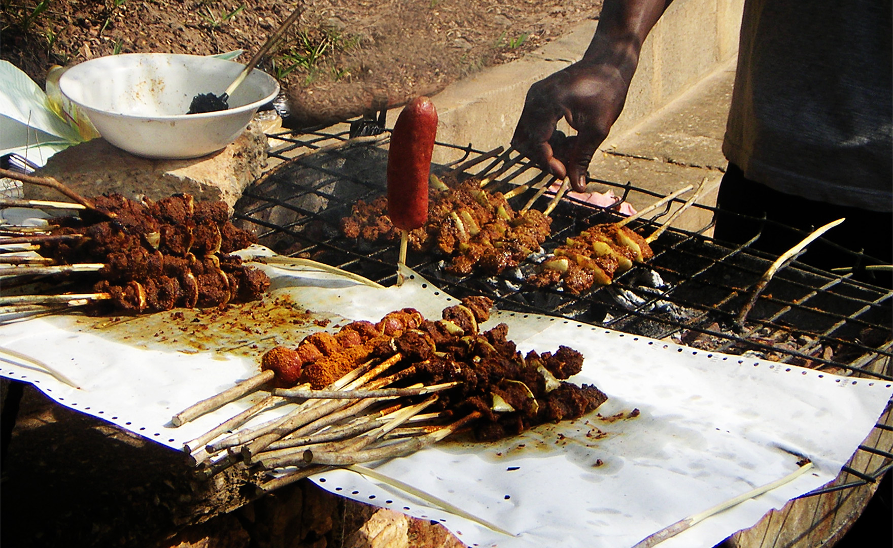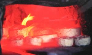 Filling the Moulds The crushed or powdered glass is filled into the pouring holes. Depending on the desired result, the bead-maker uses fine or less fine pieces of glass in one colour or in different colours. By putting the glass in particular places in the pouring holes, the colour hues of the beads can be determined exactly. In the Furnace The furnace is made of clay reinforced with iron. The iron used often stems from scrap-metal, eg. from the remains of scrapped cars. It takes a good two hours until the oven has the optimum temperature of almost 1000 degrees Celsius. The smelting procedure itself takes about 40 minutes. The exact time also depends on the colour of the glass used. This sweltering work demands a lot of experience on the part of the bead-maker.