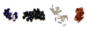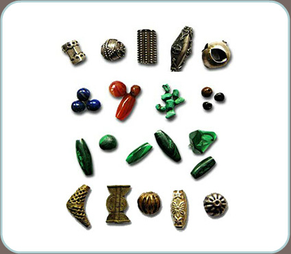 Manufacturing Metal Beads Punching: Cutting from a sheet of metal - whole beads, i.e., flat shapes are cut from the sheet of metal. For round, spiral-shaped or polygonal beads, two cut halves are soldered together. Hammering: Punched beads are worked on with a small hammer to leave small marks in the metal. This creates interesting patterns. Embossed metal: For this, an instrument into which a pattern was carved is used. When the instrument is pressed onto the metal, the pattern is embossed. Filigree work: Fne wires are twisted into elaborate patterns and soldered into beads. Surface Treatment: Coating: In order to enhance and upgrade ordinary metals, some beads are gold- or silver-plated. It is also possible to use copper, bronze or nickel. Enamel: Flowers or other attractive patterns are painted onto the beads with enamel colours. This method is used primarily in Asia to decorate beads. Lost Wax Method: With this old African method, a piece of wax is carved into the desired bead shape and covered with clay or plaster. The design of the bead is now transferred to the clay. By heating it, the wax melts and can be poured out of a hole. Molten metal is then poured into the hollow space. After it has cooled off, the clay or plaster can be removed and the finished bead can be taken out.  Gemstones - Precious